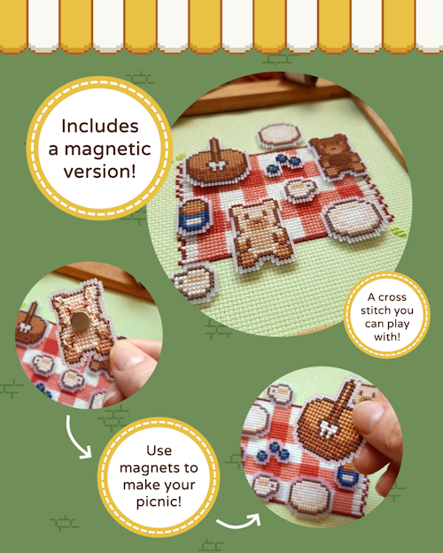 This month saw the release of the Teddy Bear Picnic! The pattern is the first to include assets from my own game, and is even interactive itself—it comes with instructions and charts for making a magnetic version!